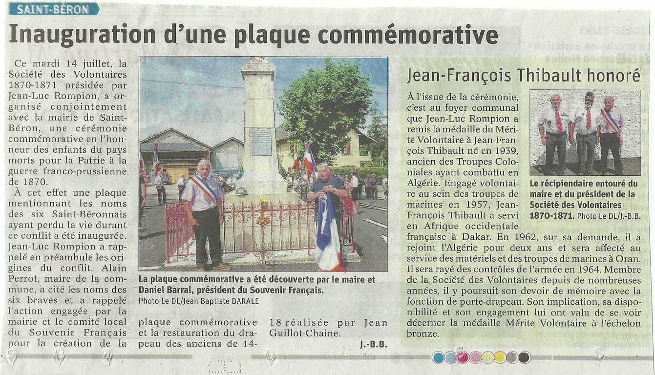 Mr le maire a retracé le parcours des six enfants de St Béron partis à la guerre Franco-prussienne de 18701871 et qui ne sont pas revenus. Les recherches effectuées aux archives départementales de la Savoie ont permis de faire connaître au public en ce jour de fête nationale que des enfants du pays ont péri pour la Patrie il y a 150 ans.