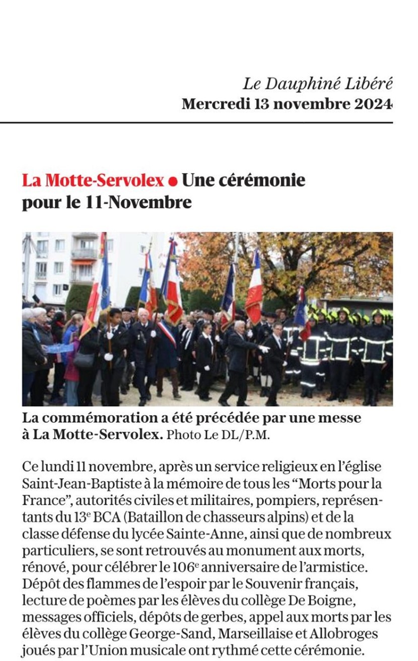 Vendredi 11 novembre, s'est déroulée au Monument aux Morts de La Motte Servolex la cérémonie du 104ème anniversaire de l'armistice de 1918, en présence des autorités civiles et militaires, des association d'Anciens Combattants, du Souvenir Français et des porte-drapeaux.