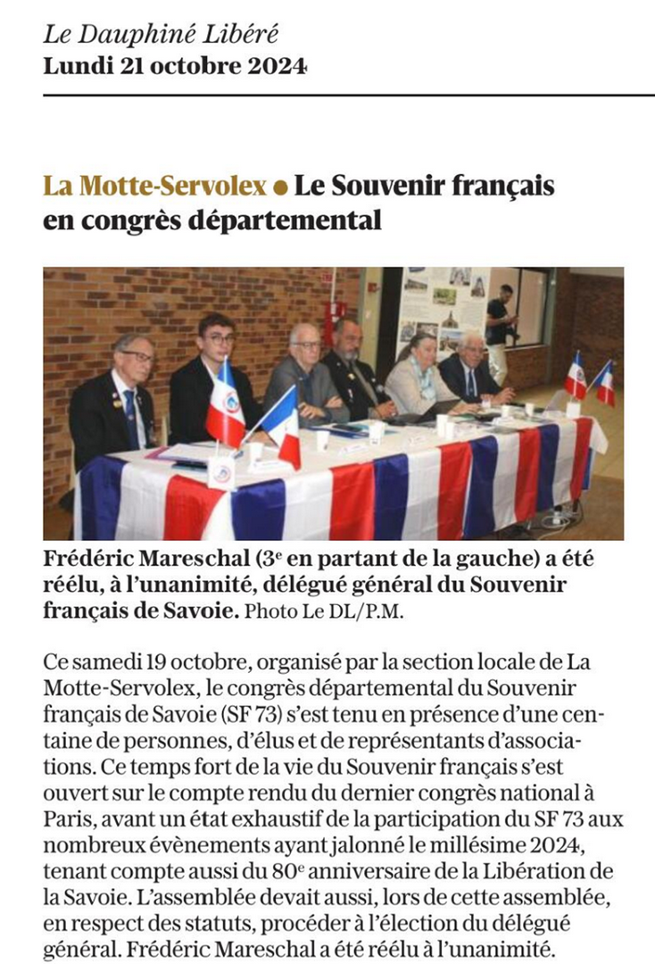 Ce samedi 19 octobre 2024, à La Motte Servolex, salle des Pervenches, s’est tenu le congrès départemental du Souvenir Français de Savoie en présence de Luc Berthoud, maire de la commune. Ce rendez-vous a réuni autour de Frédéric Mareschal, délégué général du SF 73, le jeune président du comité Loris Ghaffar et Mmes Marie-Pierre Montoro-Sadoux, vice-présidente du Conseil Régional Rhône-Alpes-Auvergne, Marie Dauchy, Députée Européenne, Laure Bonnet, Présidente de l’Association Nationale des Membres de l’Ordre National du Mérite de Savoie, Claire Koch-Crousier, directrice de l’ONaCVG, Chantal Orski, présidente de l’AFMD, de Mrs Renaud Beretti, maire d’Aix les Bains et président de l'agglomération Grand Lac, délégué à la culture et au patrimoine au conseil départemental de la Savoie, Franck Morat, Conseiller départemental, Vice-Président de la communauté d'agglomération du grand Chambéry, Brice Bernard, conseiller régional Rhône-Alpes-Auvergne, Valentin Hachet, maire de St Baldoph, représentant Mme Emilie Bonnivard, députée, Jean-Benoît Cérino, adjoint à la ville de Chambéry, le général Bernard Ratel, président de la Société des Membres de la Légion d’Honneur de Savoie et environ près d’une centaine de personnes, entre adhérents, présidents de comités et anciens combattants.