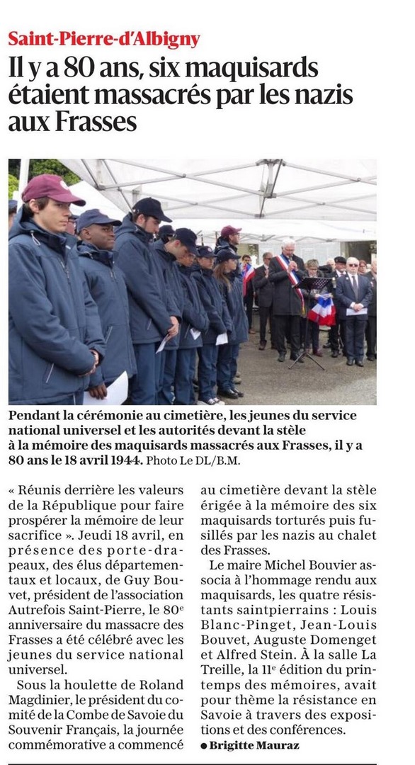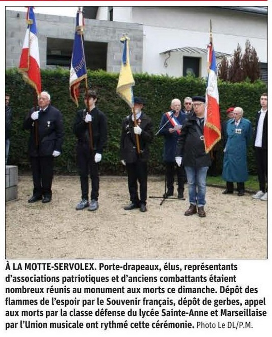 ce 8 mai 2024, s'est déroulée, au monument aux Morts de la Motte Servolex, la cérémonie du 79ème anniversaire du 8 mai 1945, en présence des autorités civiles et militaires, des associations mémorielles et des porte-drapeaux. Le Souvenir Français était représenté par Loris Ghaffar, président du comité local, de nombreux adhérents et d'un jeune porte-drapeau.