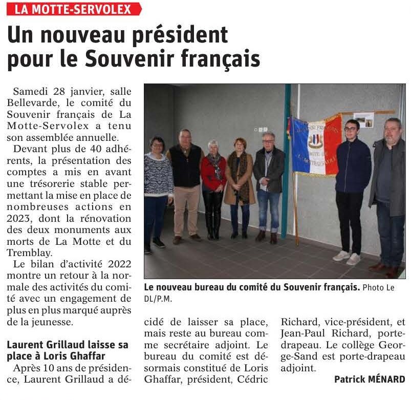 En effet, Loris, a été élu à la majorité, président du comité du Souvenir Français de La Motte-Servolex, lors de l’Assemblée annuelle du 28 janvier dernier. Il a ainsi succédé à Laurent GRILLAUD, Président depuis plus de 10 ans.