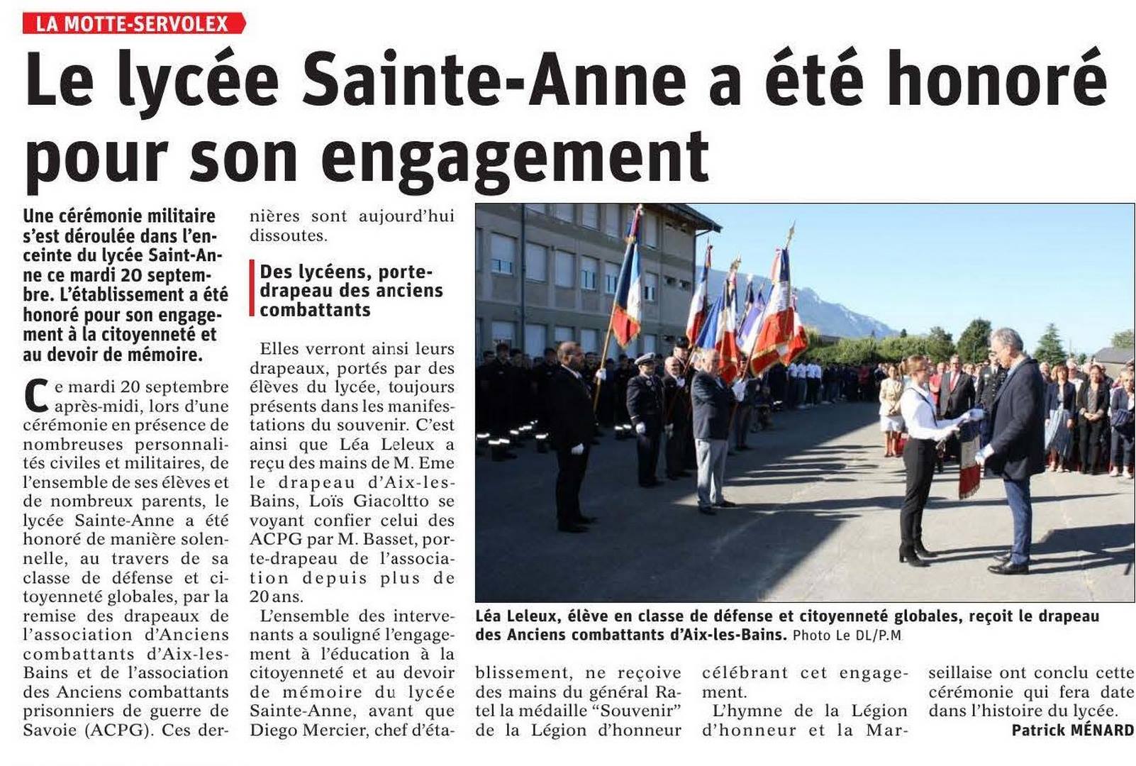 Mardi 20 septembre 2022, le Lycée Sainte Anne à la Motte Servolex, s'est vu remettre le drapeaux de l'association des Anciens Combattants d'Aix les Bains et celui des Anciens Combattants Prisonniers de Guerre, associations dissoutes à ce jour.