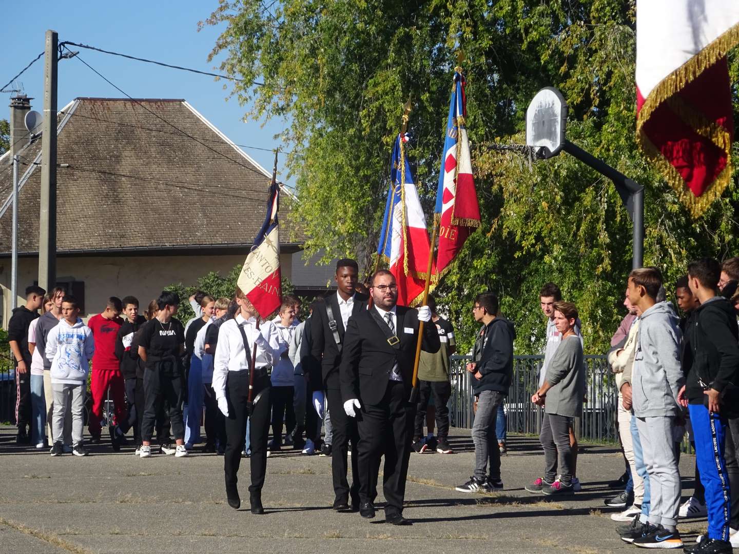 Les élèves Léa Leleux et Loïs Giacoltto, se sont vus confier les drapeaux. Ils firent un tour d'honneur devant leurs camarades, précédés par le drapeau de la Légion d'Honneur..