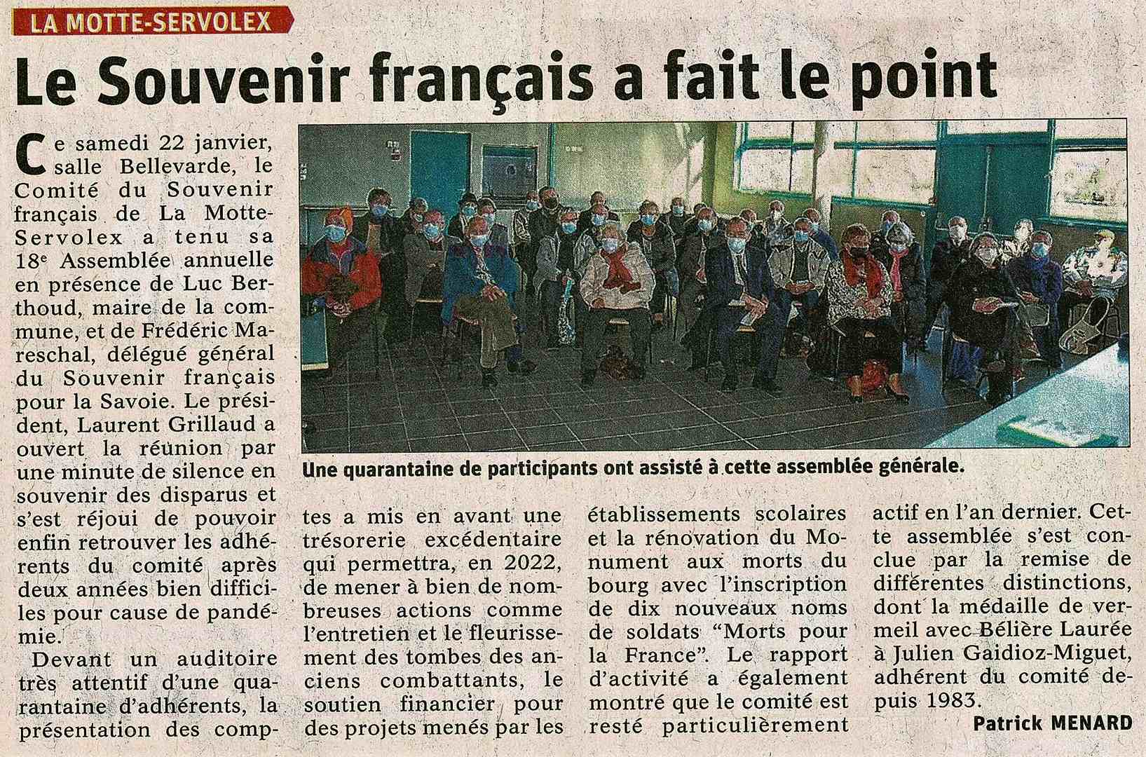 L'assemblée annuelle du comité s'est déroulée le samedi 20 janvier, à la salle Bellevarde à la Motte Servolex, en présence de Luc Berthoud, maire de la commune et conseiller départemental, Jean-Yves Sardella, délégué général adjoint du Souvenir Français de la Savoie et de nombreux adhérents.