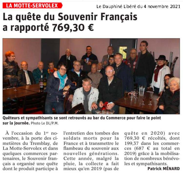 La quête annuelle du Souvenir Français, à la porte des cimetières du Tremblay et de La Motte Servolex ainsi que dans les magasins partenaires a été supérieure à celle de 2019.