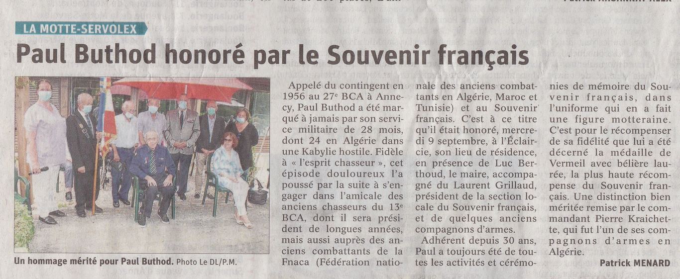 Mercredi 9 septembre 2020, Monsieur Paul Buthod s'est vu remettre la Médaille de Vermeille avec Bélière Laurée, pour ses 30 années de fidélité au Souvenir Français.