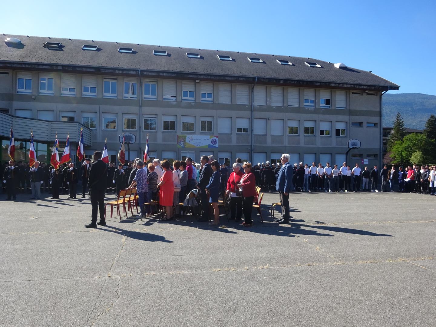 Les élèves Léa Leleux et Loïs Giacoltto, se sont vus confier les drapeaux. Ils firent un tour d'honneur devant leurs camarades, précédés par le drapeau de la Légion d'Honneur..