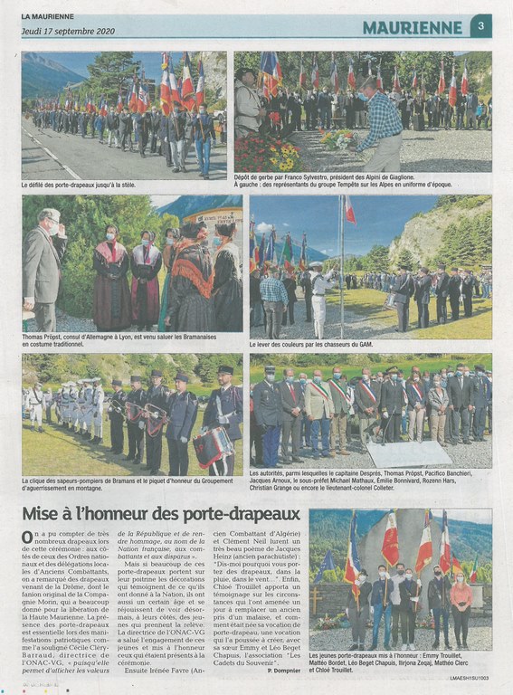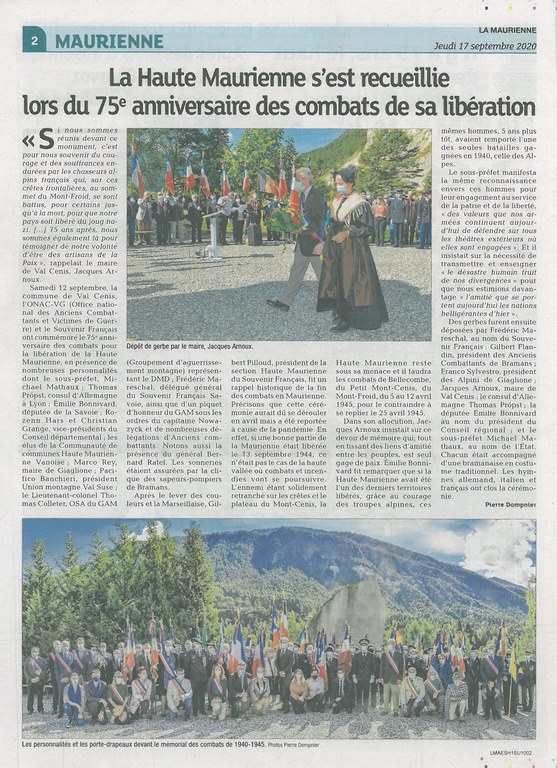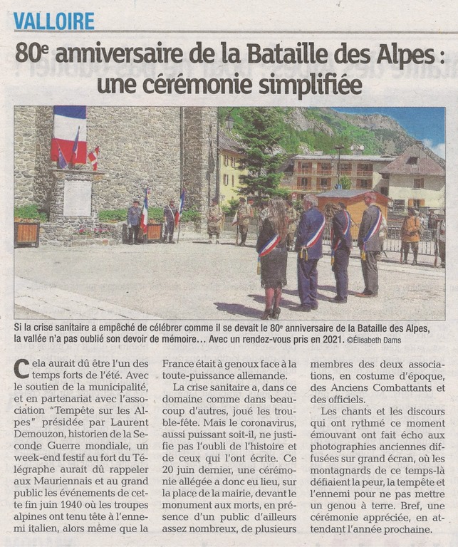 Cependant, afin de pallier le report de cet anniversaire important, Laurent Demouzon, historien local et spécialiste du sujet, guide du patrimoine Savoie-Mont-Blanc, en partenariat avec l’association de reconstitution historique « Tempête sur les Alpes », le Souvenir Français Délégation de Savoie et des communes de Val Cenis (col du Mont-Cenis), Bramans, Modane, Valmeinier et Valloire a organisé des cérémonies avec prises d’armes, dépôt de gerbes dans chacune de ces communes. Le beau temps, les anciens combattants, les porte-drapeaux, madame la députée Emilie Bonnivard, mesdames et messieurs les conseillers départementaux, les maires et le public furent bien présents.
