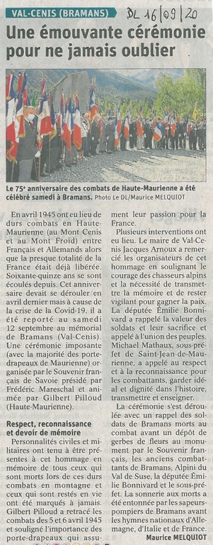 C'est le samedi 12 septembre 2020 que s'est déroulée, au Mémorial de Bramans, la cérémonie du 75ème anniversaire de la bataille du Mont Froid, (initialement prévue en avril mais reportée en raison du confinement), organisée par La commune de Val-Cenis, l'ONACVG et le Souvenir Français.