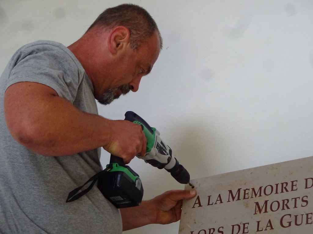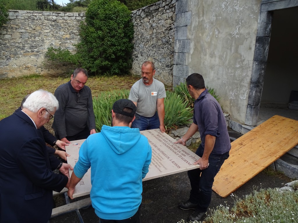 Ce ne fut pas une petite affaire car la plaque en marbre pesait son poids et était plus large que la porte. Mais tout s'est bien passé et la plaque a bien été installée.