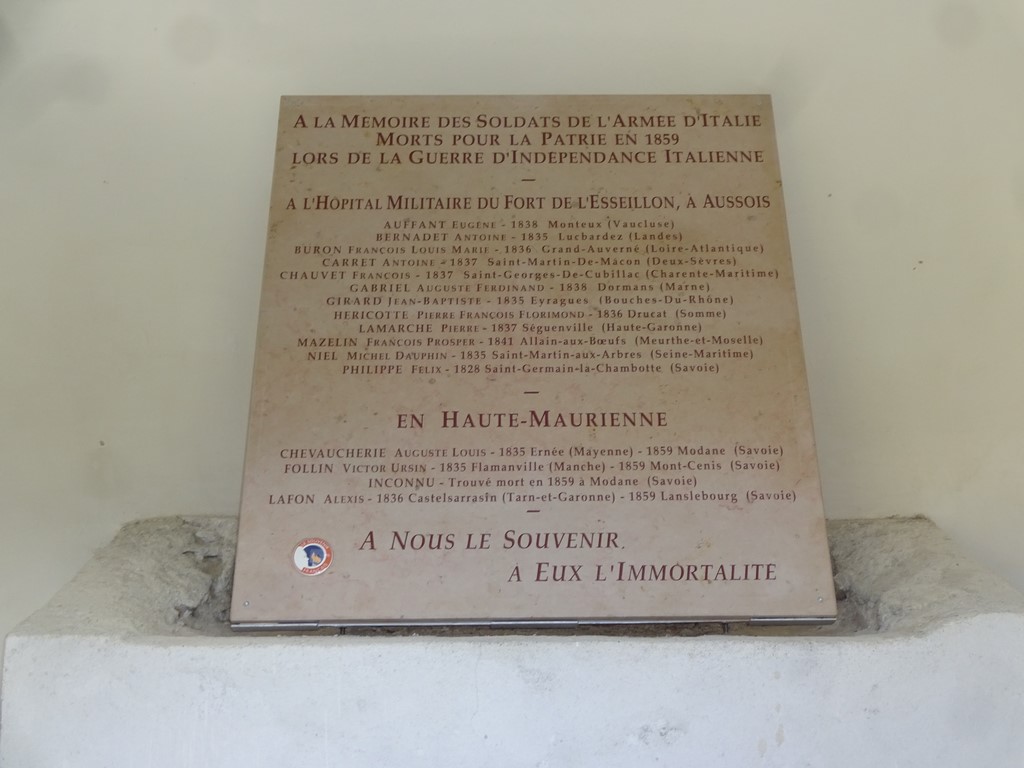 Les blessés de ces batailles étaient essentiellement transportés dans des hôpitaux militaire dans la province de Nice, alors que les soldats ayant contracté une maladie sur les champs de bataille étaient transportés à Briançon ou aux forts de l’Esseillon, transformé pour l’occasion en hôpital militaire. 12 de ces malades succombèrent en ces lieux et furent inhumés dans le cimetière où nous nous trouvons. Seule une plaque générique nous informe de la présence de ces soldats. Il était donc indispensable d’apposer une nouvelle plaque avec les noms de ces 12 soldats dont 11 étaient Français et 1 Savoyard.