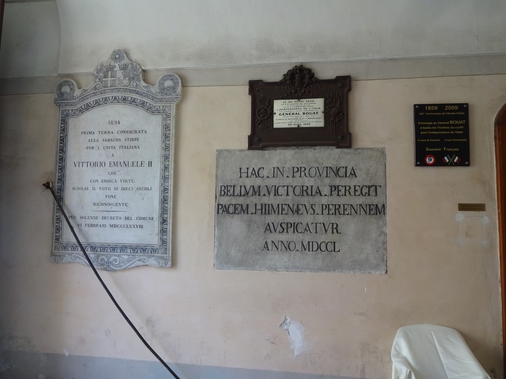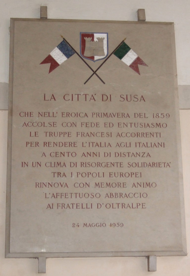 - En 1959, lors du 100ème anniversaire c'est la ville de Susa qui apposa une plaque sur laquelle on peut lire : " La Ville de Susa qui dans l’héroïque printemps 1859 accueillit avec foi et enthousiasme les troupes françaises venues pour rendre l’Italie aux Italiens à cent ans d’écart dans un climat de solidarité qui renait entre les peuples européens rénove avec âme et ferveur l’affectueuse étreinte aux frères transalpins. 24 mai 1959 "