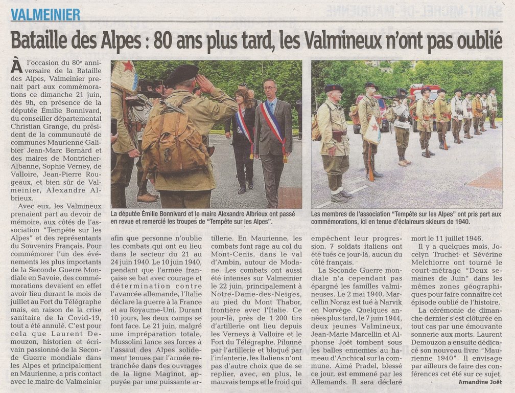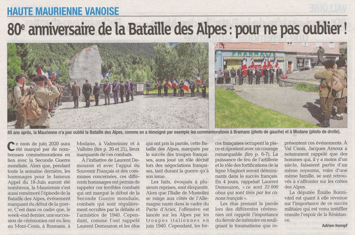 Cependant, afin de pallier le report de cet anniversaire important, Laurent Demouzon, historien local et spécialiste du sujet, guide du patrimoine Savoie-Mont-Blanc, en partenariat avec l’association de reconstitution historique « Tempête sur les Alpes », le Souvenir Français Délégation de Savoie et des communes de Val Cenis (col du Mont-Cenis), Bramans, Modane, Valmeinier et Valloire a organisé des cérémonies avec prises d’armes, dépôt de gerbes dans chacune de ces communes. Le beau temps, les anciens combattants, les porte-drapeaux, madame la députée Emilie Bonnivard, mesdames et messieurs les conseillers départementaux, les maires et le public furent bien présents.