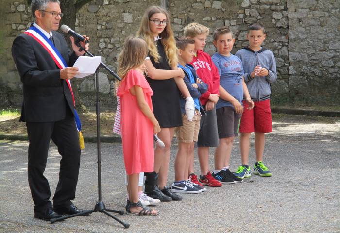 Sept enfants des écoles, 3 filles et 4 garçons, ont, ensuite, été invités à tour de rôle, à prendre le relais en donnant lecture du magnifique poème de Paul Éluard :
