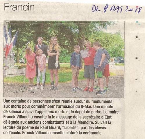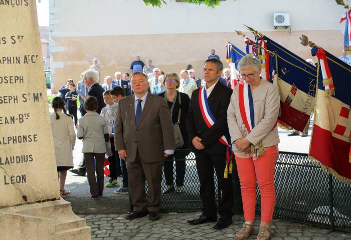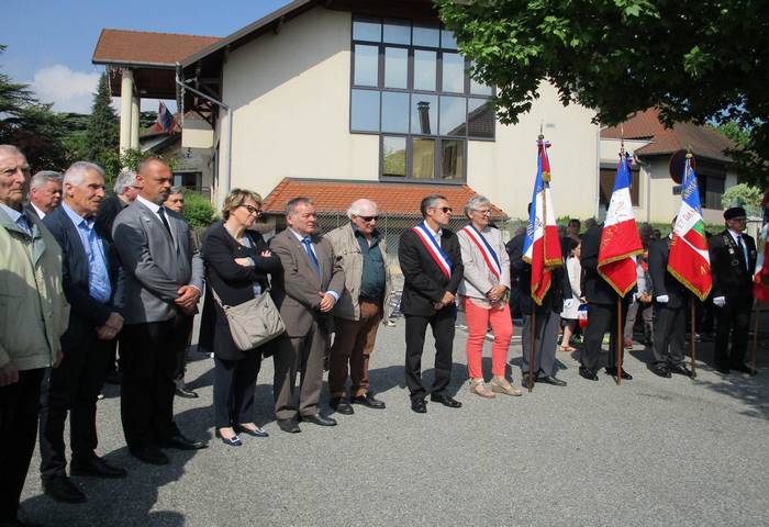 Ce matin au monument aux Morts plus de 80 personnes, à l'invitation de la Municipalité et des Porte-drapeaux Jean-Yves Sardella (de la délégation Générale du Souvenir Français de Savoie) et la jeune Laura, Philippe Levèque, du 13ème BCA, et Jean Rubagotti, ancien combattant s'étaient donné rendez-vous pour célébrer l'anniversaire de la signature de l'Armistice du 8 mai 1945 mettant fin au deuxième conflit mondial. Après le dépôt de gerbe et la lecture des victimes francigneraines des deux conflits mondiaux par Marc Perrin, Capitaine de la Réserve, monsieur le Maire, Franck Villand a lu le communiqué de Geneviève Darrieussecq Secrétaire d'État en charge des Anciens Combattants.