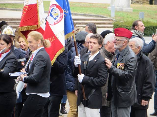Jean-Pierre Durot porte-drapeaux du Comité à confié le drapeau de la Combe de Montmélian au jeune Eryan GAUVRIT, élève de la Classe Sécurité Globale Citoyenneté du Lycée Louis Armand de Chambéry, devant les autorités de la ville, les anciens combattants, au Monument aux Mort et au Carré Militaire de la ville. Merci à Eryan pour sa présence et pour sa première prestation.