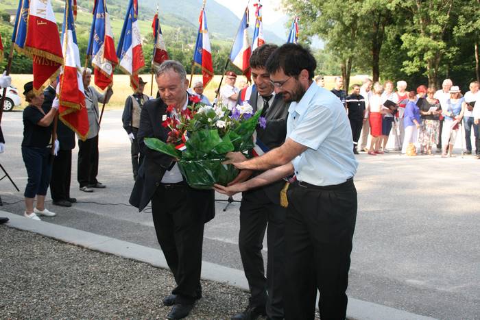 Dépôt de gerbe par Jean-Noël Parpillon, délégué général du Souvenir Français de la Savoie, Carlo Appratti, maire de la commune d'Arbin et Ghislain Garlatti, président du comité de Montmélian