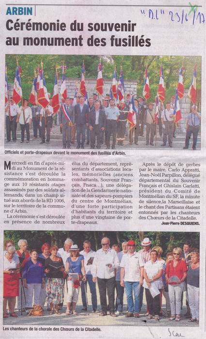 Hommage aux fusillés d'Arbin le 21 juin 1944