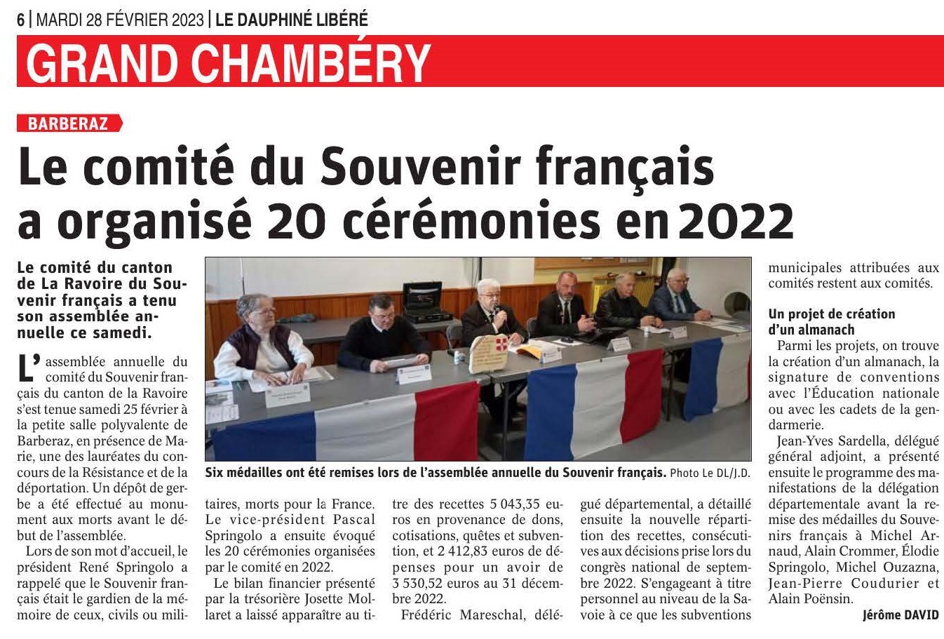 Après un dépôt de gerbe au monument aux Morts de Barberaz, René Springolo, président du comité à ouvert l'assemblée. Pascal Springolo à ensuite fait les ilan des sorties du drapeau en 2022, puis Josette Mollaret à présenté le rapport comptable 2022.
