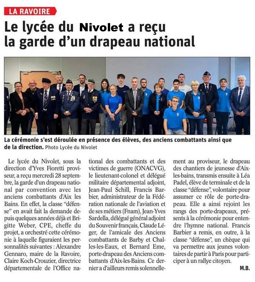Mercredi 28 septembre 2022, la classe « Défense » du lycée Le Nivolet de La Ravoire, sous la direction de son proviseur, Mr Yves Fioretti et de Mme Brigitte Weber, CPE, cheffe du projet, ont supervisé cette cérémonie, en présence du maire de la commune, Mr Francis Gennaro, de Mme la Directrice de l’ONACVG, du Lt-Colonel Schill, de Mr Francis Barbier, administrateur de la Fédération de l’Aviation et de ses Métiers (FNAM), de Mr Jean-Yves Sardella Délégué Général-Adjoint du Souvenir Français de Savoie, et de Mr Franck Pécôt, président du comité d’Aix-les-Bains. En présence de porte-drapeaux des comités de La Ravoire et d’Aix-les-Bains.