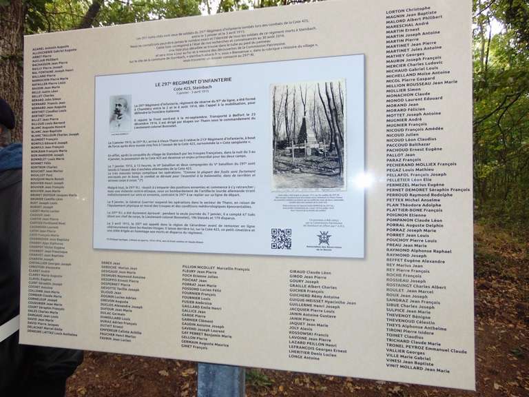 La stèle du 297ème RI érigée par les soldats eux-mêmes (voir photos), fut laissée longtemps à l'abandon dans des buissons au milieu d'une forêt. Elle fut rénovée grâce à l'action du Souvenir Français local et de diverses associations culturelles et patriotiques des villes de Steinbach et de Thann, ainsi qu'a de généreux donateurs comme l'ARS qui a financé un panneau sur lequel est expliqué l'historique de cette stèle et où sont inscrits les noms des 200 tués ou disparus connus à ce jour, des combats de la côte 425.