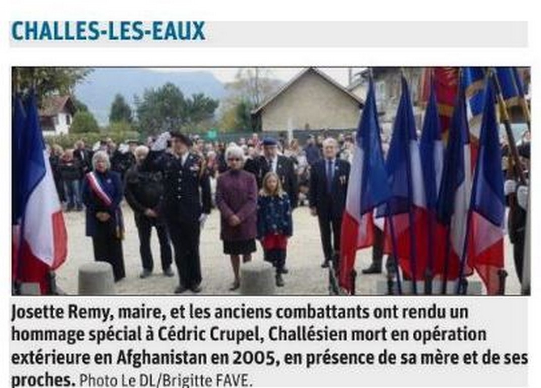 Le Souvenir Français a souhaité célébrer à Challes-les eaux ce 11 novembre comme le préside le président de la République en ce jour, une cérémonie d'un monument des combattants mort pour la France en OPEX aujourd'hui, ici nous rendons hommage au caporal-chef Cédric Roger François CRUPEL tombé en Afghanistan en 2005 pour nous Souvenir Français, pour vous les anciens Combattants,