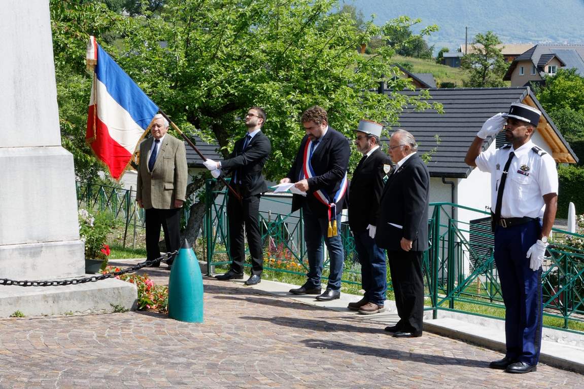 Alain Coudrot représentait la base Aérienne de Ambérieu, Pierre Gathié les Anciens Combattants. Valentin Hachet porte-drapeau et délégué défense avec Alain Poënsin ( képi gris ) représentait le Souvenir Français et Guillaume Bergamin représentant la brigade de Challes