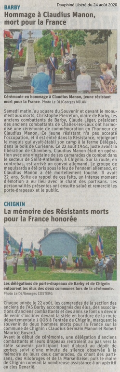 Une première cérémonie s'est déroulée au monuments aux Morts de Barby en hommage à Claudius Manon natif de la commune. Elle fut suivie par une seconde cérémonie à Chignin, à la stèle route départementale 1006, en hommage à Claudius Manon et Robert Govard,