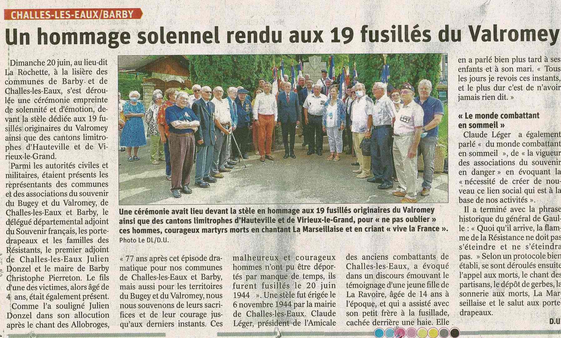 Dimanche 20 juin 2021 une cérémonie en hommage aux otages du Valromey fusillés ici, à Challes-les-Eaux le 20 juin 1944 s'est déroulée en présence des élus de Barby et Challes-les-Eaux, de représentants d'associations, de familles des fusillés, des porte-drapeaux venus du Valromey ainsi que de la Savoie. La délégation générale du Souvenir Français était représenté par Mr M. Arnaud, délégué général Adjoint, le comité de La Ravoire était également présent.