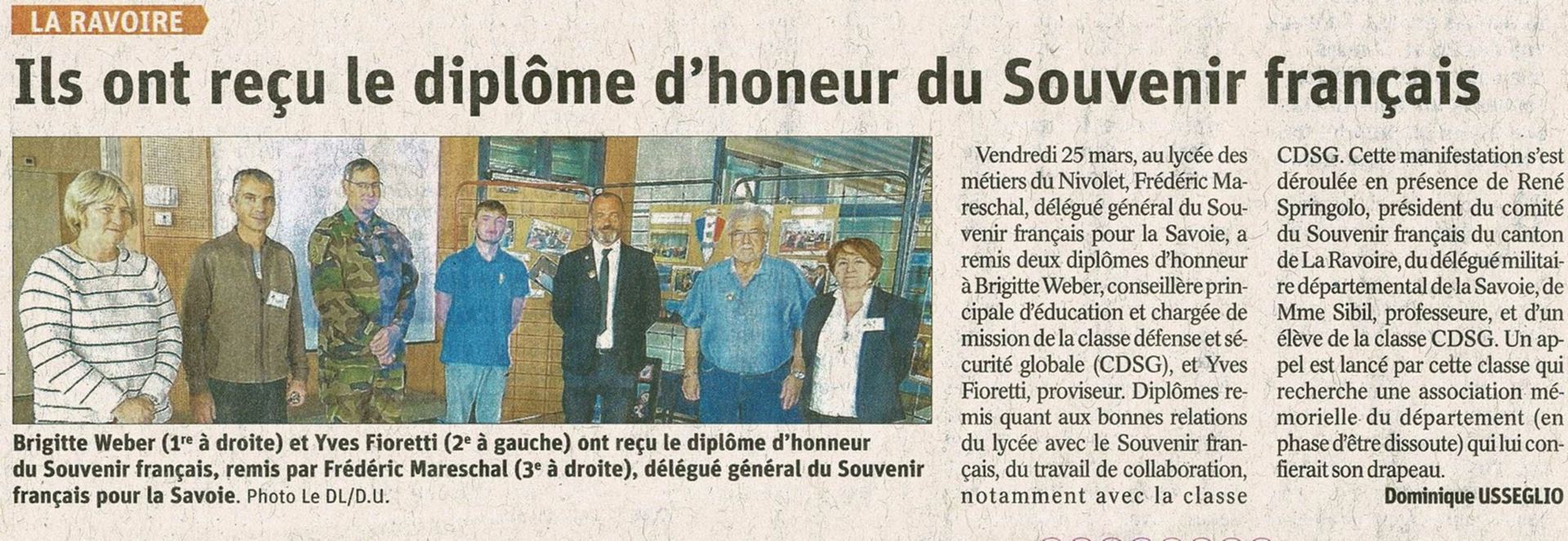Vendredi 25 mars, au lycée des métiers du Nivolet, Madame Brigitte Weber, conseillère principale d'éducation chargée de la Classe Défense et Sécurité Globale, et Monsieur Yves Fioretti, proviseur, ont reçu, des mains de Frédéric Mareschal Délégué Général pour la Savoie, le diplôme d'honneur du Souvenir Français.