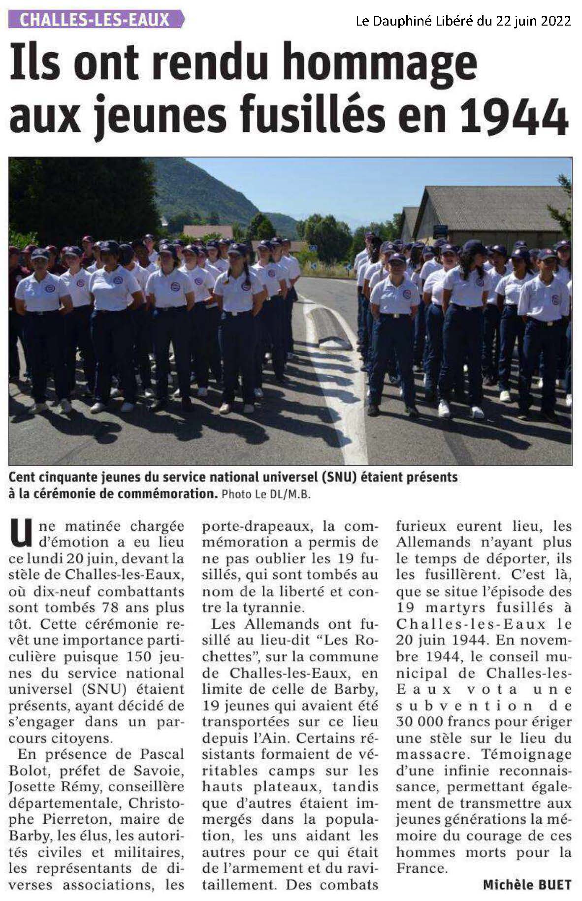 Lundi 20 juin 2022 une cérémonie en hommage aux otages du Valromey fusillés ici, à Challes-les-Eaux le 20 juin 1944, s'est déroulée en présence de :