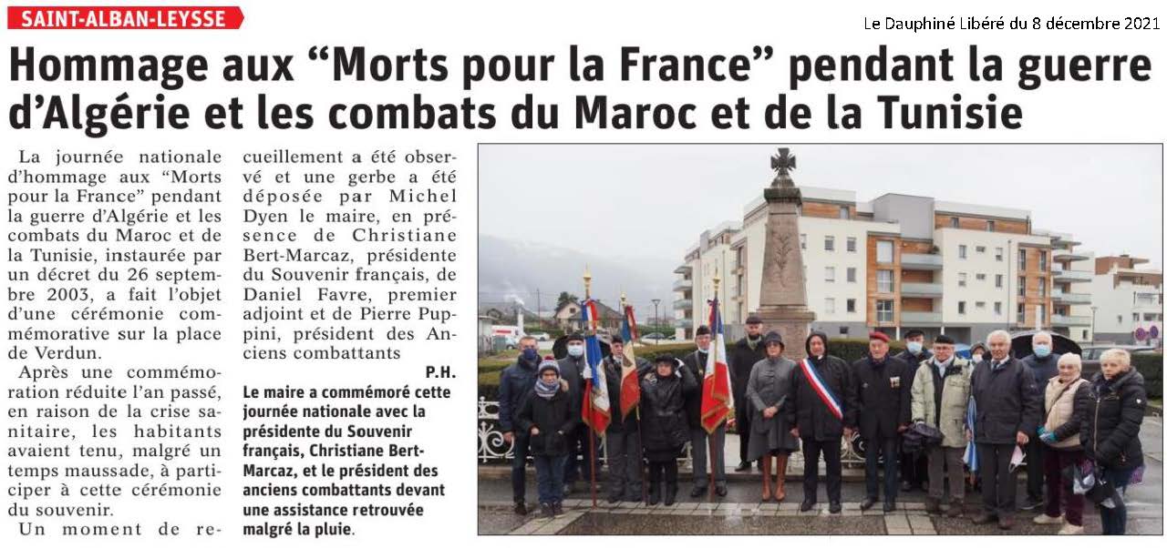 Cérémonie du 05 décembre 2021 au monument aux morts de Saint Alban Leysse, en présence des autorités civiles, des associations mémorielles et d'anciens combattants, des porte-drapeaux.
