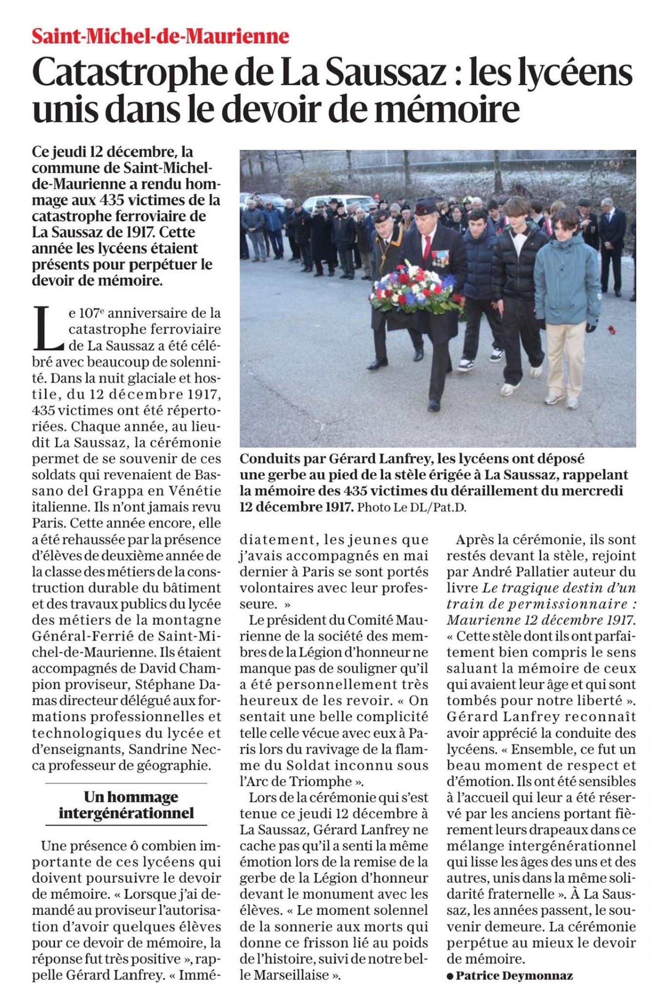 Le 12 décembre 2024 à Saint Michel de Maurienne, s'est déroulée une cérémonie en hommage aux victimes du déraillement du 12 décembre 1917, en présence des autorités civiles et militaire et des associations mémorielles, dont le Souvenir Français.