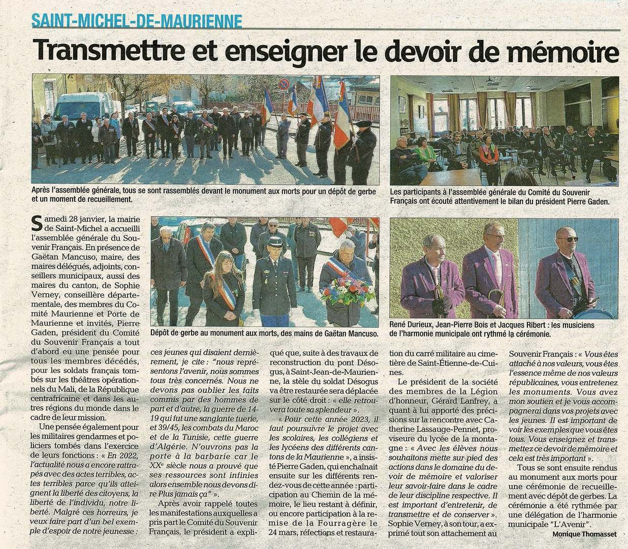 Samedi 28 janvier 2023, s'est tenu l'assemblée annuelle du comité de Porte de Maurienne, à Saint Michel de Maurienne, en présence, pour les autorités, de Gaëtan Moncuso , maire de St Michel de Maurienne, Sophie Verney, conseillère départementale, pour la délégation générale du Souvenir Français de Savoie, Henr Gottero, délégué général adjoint,, Edith Sardella, trésorière, des maires avoisinants et d'une assistance nombreuse.