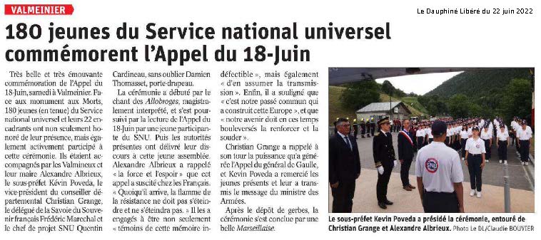 180 jeunes du Service National Universel, 22 encadrants et Quentin Cardinaud, chef de projet SNU, ont participé, le 18 juin 2022 à Valmeinier, à la commémoration de l'appel du 18 juin 1940.