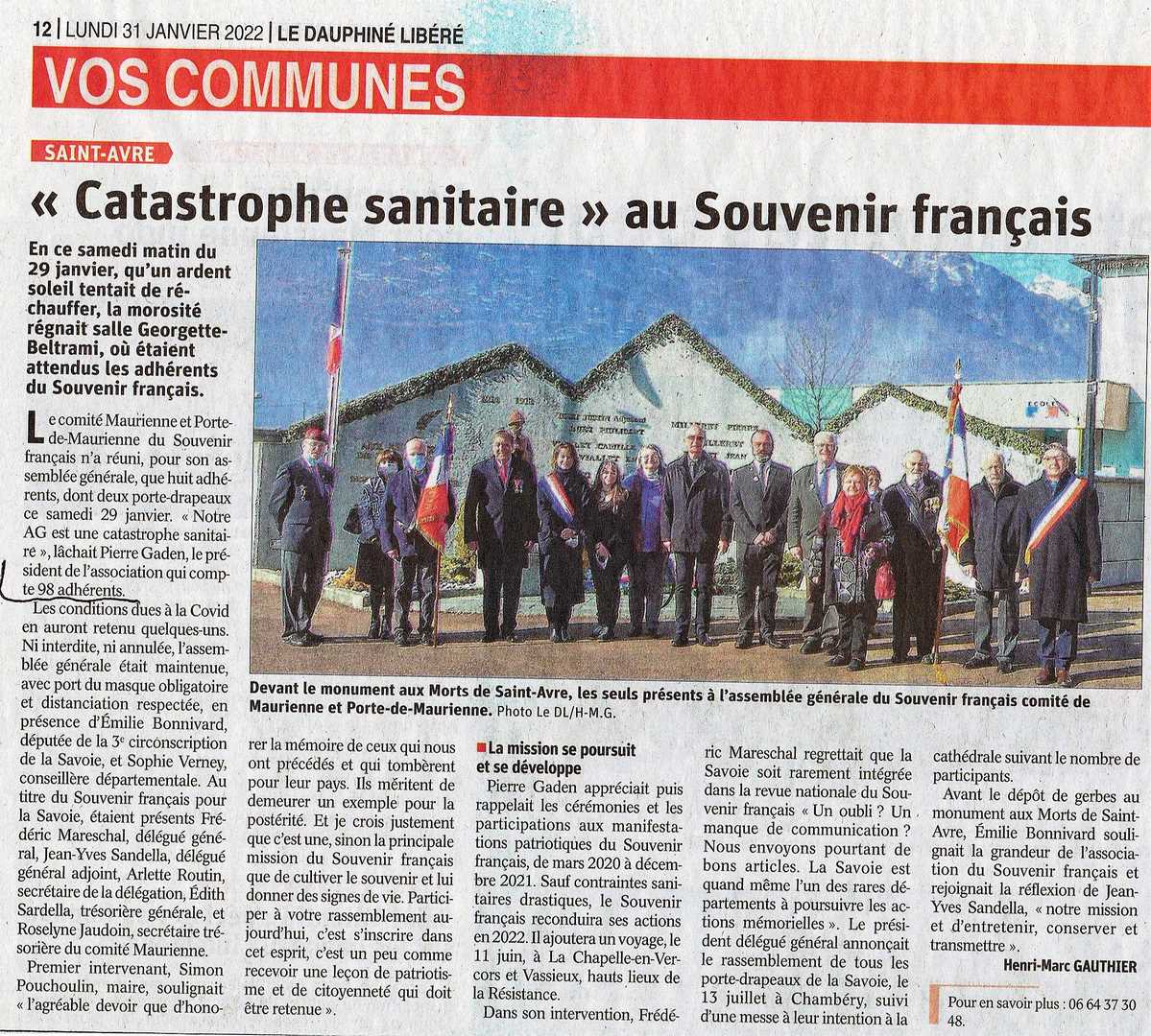 Samedi 29 janvier 2022, s'est tenu l'assemblée annuelle du comité de Maurienne, à Saint Avre, en présence, pour les autorités, de Simon Pouchoulin, maire de St Avre, Sophie Verney, conseillère départementale, Emilie Bonnivard, députée et conseillère régionale, et pour la délégation générale du Souvenir Français de Savoie, Frédéric Mareschal, délégué.général, Jean-Yves Sardella, délégué général adjoint,, Edith Sardella, trésoriére et Arlette Routin secrétaire.