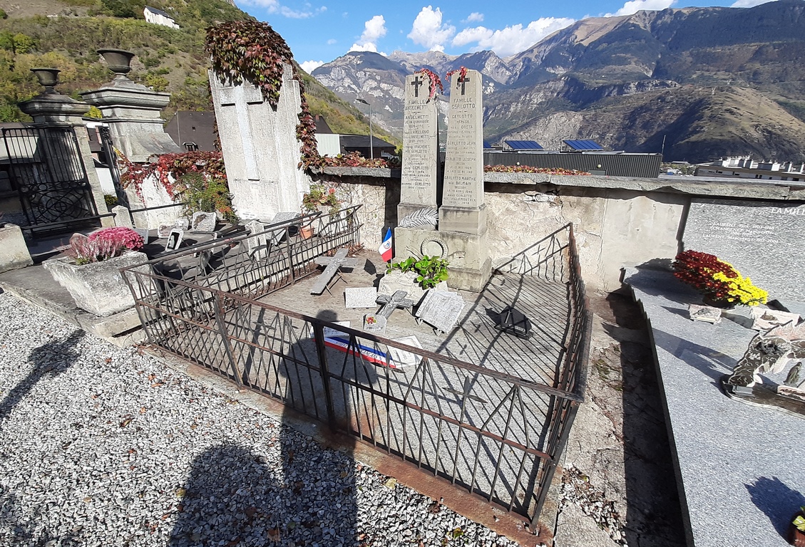 Les deux anciens cimetières locaux appelés « TOSI » et « DUC » sont contigus et seulement séparés par un mur mitoyen avec plusieurs ouvertures pour passer de l’un à l’autre. Le cimetière « Tosi » abrite le carré militaire édifié après le premier conflit mondial (cliché 1). Dans le cimetière « Duc », une concession, propriété de la commune, a été aménagée en second carré militaire, dans lequel reposent les dépouilles des anciens combattants enterrés dans les deux cimetières, mais dont les tombes sont en déshérence. Huit anciens combattants y ont été tranférés. (cliché 2)