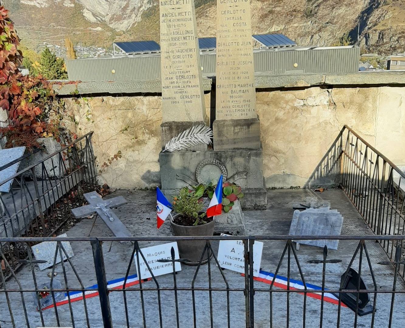 En cette année 2019 une nouvelle halte a été observée toujours dans le cimetière « Duc » ; devant le caveau de la famille GERLOTTO (cliché 3), lieu de sépulture du Général Maurice GERLOTTO, un des chefs militaires de la résistance en Maurienne lors du second conflit mondial (décédé en 1980) et de son fils, le lieutenant Jean-Pierre Marcelin GERLOTTO, mort pour la France le 7 Avril 1978 au Tchad. Il est l’un des quatre savoyards répertoriés au Mémorial National des OPEX inauguré le premier novembre 2019.