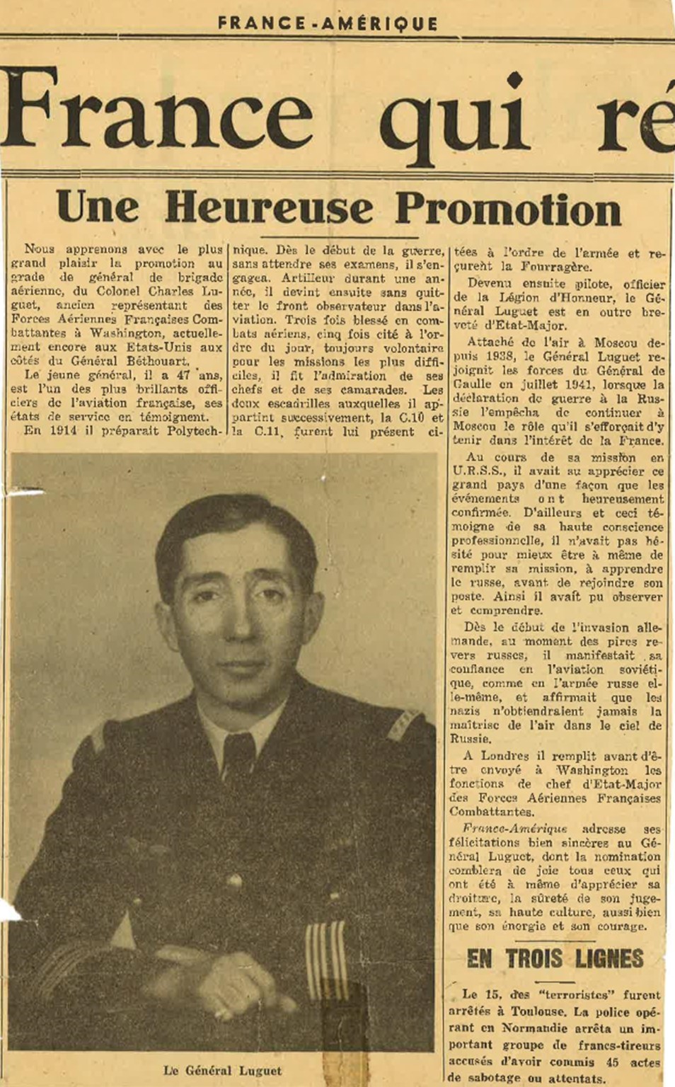 Le 1er décembre 1941, Charles-A Luguet est Chef d'Etat-Major des FAFL à Londres. Fort de sa connaissance géostratégique récente de l'URSS, Il convainc le général de Gaulle de projeter un groupe d'aviation de chasse française combattante sur le font de l'Est, au côté de l'armée soviétique. Ce groupe de chasse « Normandie » s'illustre de 1943 à 1945 contre la Luftwaffe, au-dessus du Niemen en particulier. Devenu mythique en Russie, il est hissé au rang de Régiment de Chasse et est rebaptisé «Normandie-Niemen».
