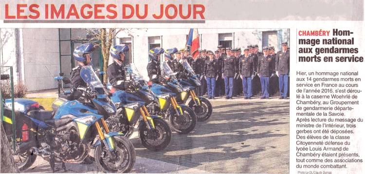 Une cérémonie d’hommage aux personnels de la gendarmerie morts dans l’accomplissement de leur devoir en 2016 a été organisée le jeudi 16 février 2017 dans la cour d’honneur de la caserne Woehrlé de Chambéry, au Groupement de gendarmerie départementale de la Savoie, en présence des autorités administratives, judiciaires et militaires de la région, des élus, des retraités, des veuves, des familles, des élèves de la classe Citoyenneté défense du Lycée Louis Armand et de Jean-Noël Parpillon, Délégué Général du Souvenir Français de la Savoie.