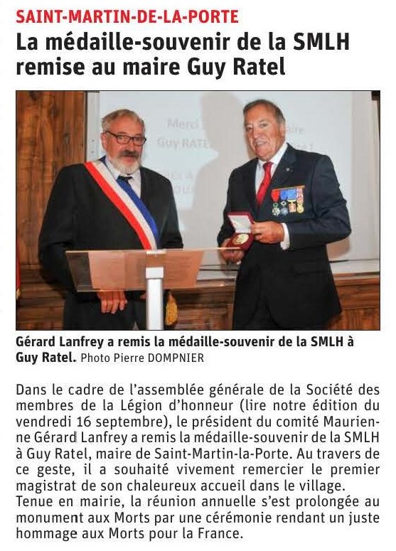 Vendredi 9 septembre s'est déroulée l'assemblée générale de la Société des Membres de la Légion d'Honneur à Saint Martin de la Porte, en présence de la délégation générale du Souvenir Français de Savoie représentée par Henri Gottero et Jean-Yves Sardella tous deux délégués généraux adjoints.
