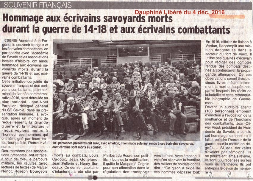 Évocation aussi de : Henry Bordeaux, Louis Cadoux, Jean Gotteland, Jean Pellerin. Après un moment de recueillement, Jean-Noël Parpillon, Délégué Général de Savoie du Souvenir Français, présenta le programme en ces termes : « Nous voulons mettre à l’honneur ces hommes qui ont témoigné par leurs textes, leurs poésies, l’horreur vécue. »
