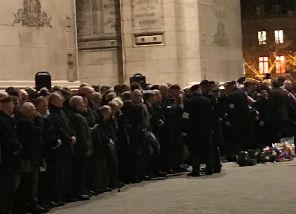 Dès la nuit tombante, 120 porte-drapeaux dont une quarantaine du Souvenir Français se rangent aux abords de l’avenue des Champs Elysées.
