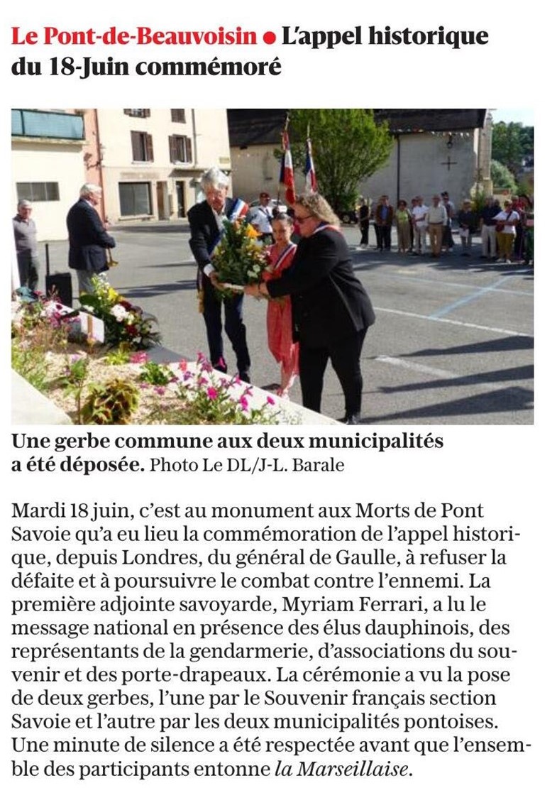 Mardi 18 juin 2024, à Le Pont de Beauvoisin (savoie), s'est déroulée la commémoration de l'appel du 18 juin 1940 par la général de Gaulle en présence des autorités civiles et militaires et des porte-drapeaux. Une gerbe à été déposée par Annie Lecocq, secrétaire du comité local du Souvenir Français.