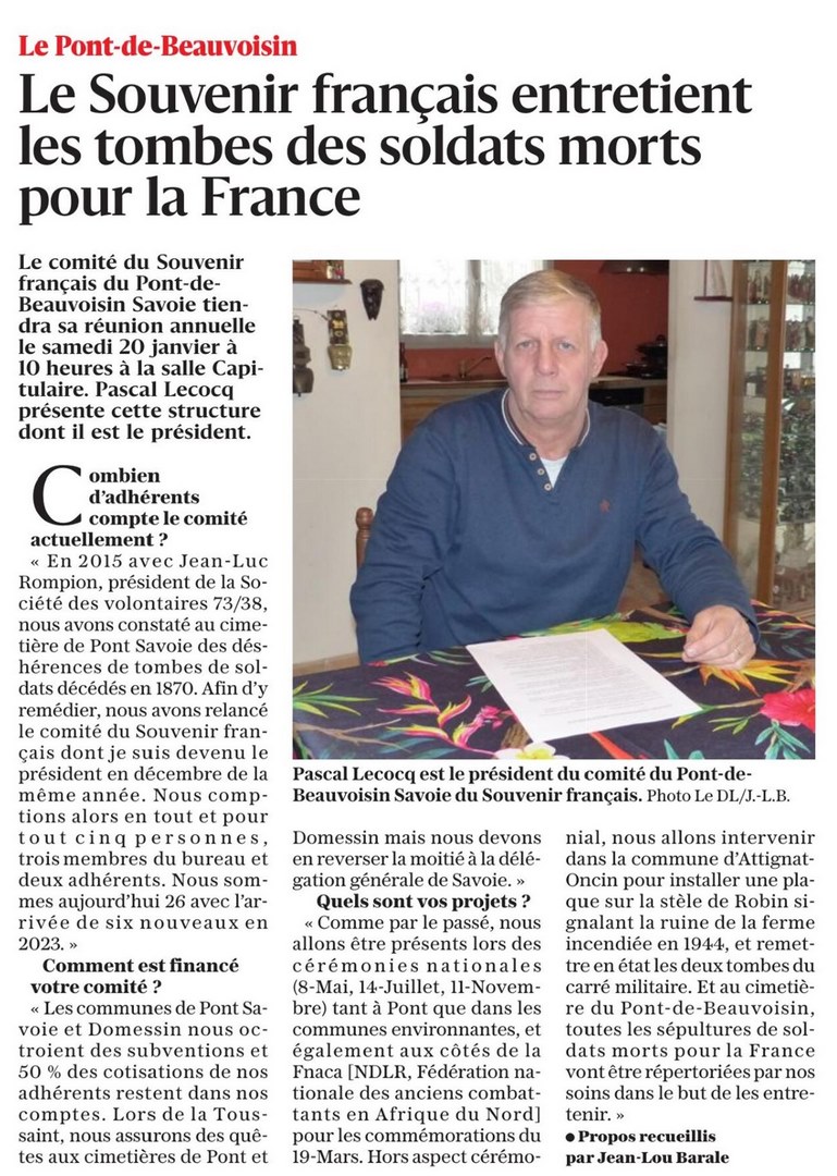 L'assemblée annuelle du comité de Pont de Beauvoisin, Savoie, s'est tenue le samedi 18 février 2023 à la salle Capitulaire en présence, pour la délégation générale, de Frédéric Mareschal, délégué général, Jean-Yves Sardella, délégué général adjoint et Edith Sardella, trésorière, les présidents des comités de Saint Béron et Pont de Beauvoisin, Isère, du maire de Attignat Oncin, Thomas Ilbert, des représentants de la municipalité de Pont, du représentant de la FNACA, des portes drapeaux et des adhérents du comité.