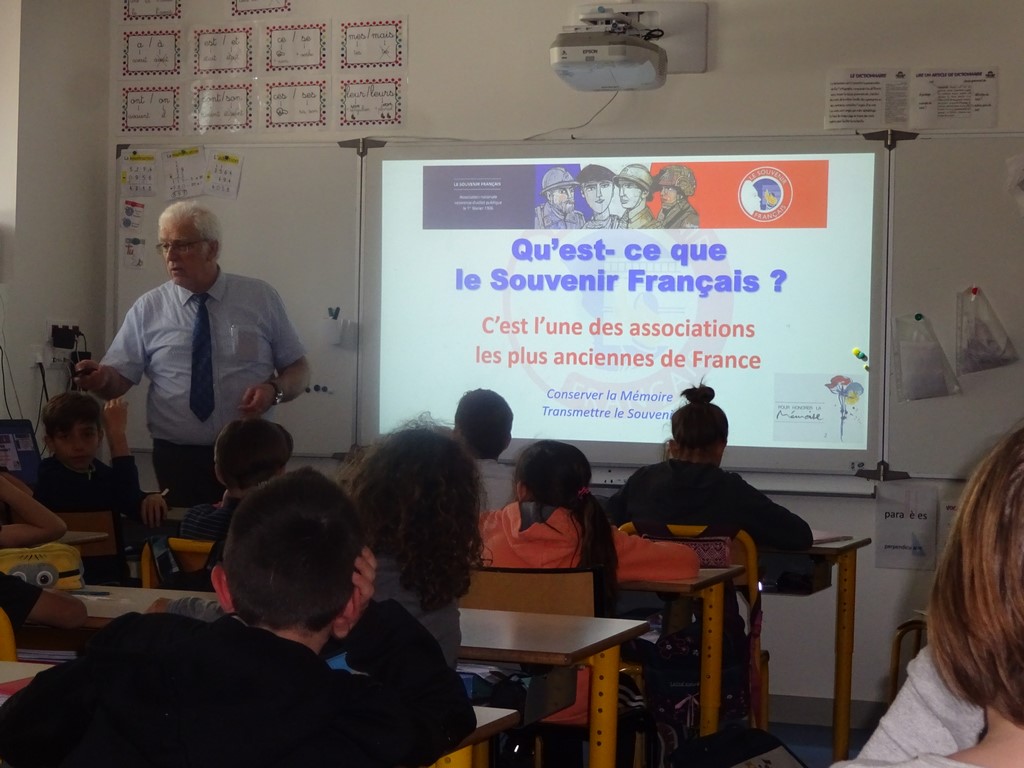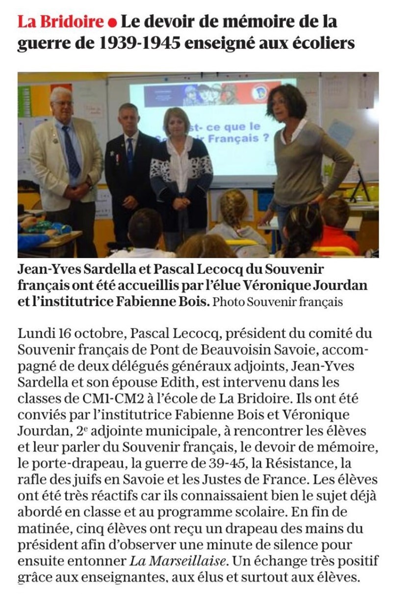Le 2 avril 2019 , le Président Lecocq Pascal, du Comité du Souvenir Français du Pont de Beauvoisin, accompagné de 3 membres de la Délégation la Savoie : JY Sardella, Délégué Général Adjoint de Savoie, Edith Sardella (Trésorière DG), et Arlette Routin (Secrétaire DG) sont intervenus dans les classes de CE1,CE2, CM1 et CM2 à l'école des Allobroges pour présenter aux élèves le Souvenir Français : Devoir de Mémoire, Souvenir, le Drapeau et la Transmission, Fondamentaux de l’Association Nationale. Le président Lecocq tient à remercier les enseignantes : Mmes Braise et Lardeux pour leur investissement.
