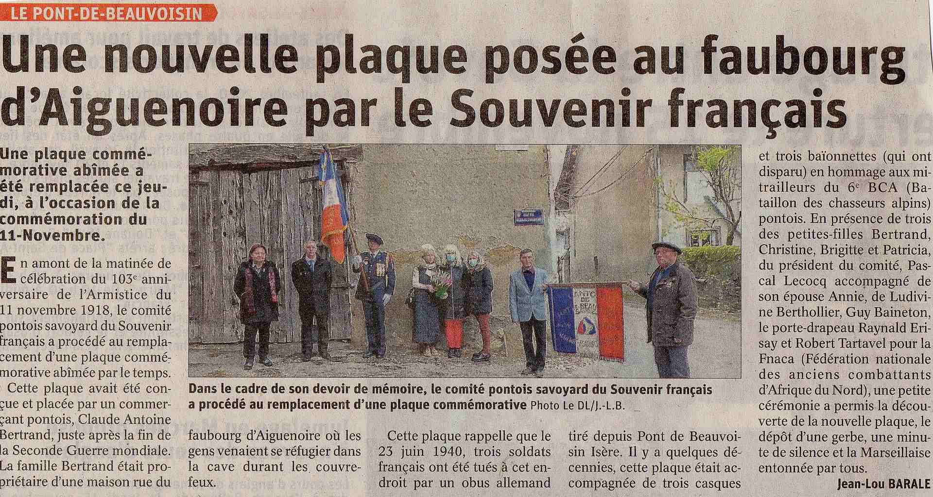 Avant la cérémonie du 11 novembre, au monument aux Morts, le comité du Souvenir Français, Pascal Lecocq, son président, a inauguré une plaque Rue Faubourg Aiguenoire, plaque remplaçant le plaque d'origine détériorée par le temps.