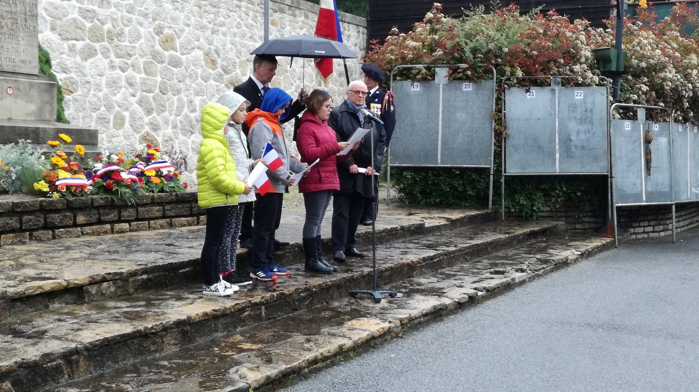 Cérémonie du 8 mai 2019 : 74ème anniversaire de la capitulation de l'Allemagne. C'est sous la pluie que la cérémonie c'est déroulée ! Merci à la présences des élus des deux Pont de Beauvoisin , à la gendarmerie, aux sapeurs pompiers, à Mme Lardeux ( Enseignante aux Allobroges) accompagnée de quelques élèves qui ont énuméré le nom des soldats morts pour la France du monument aux morts sous l’abri du Président du Souvenir Français pontois : Lecocq Pascal.