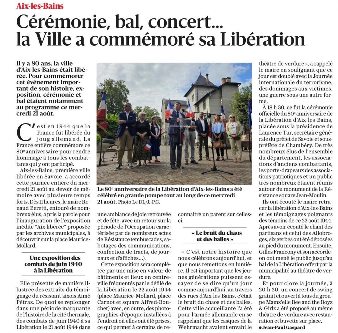 A 18h30 s'est déroulée la cérémonie pour commémorer le 80ème anniversaire de la libération de la ville. en présence des autorités civiles et militaires, des associations d'anciens combattants, du Souvenir Français , représenté par Jean-Yves Sardella, délégué général adjoint, Franck Pécot, président du comité local, et des porte-drapeaux. Des témoignages émouvants de témoins ayant assistés à la libération de la ville ont terminé les discours, avant le dépôt de gerbes, la minute de silence, la Marseillaise et le salut aux porte-drapeaux.