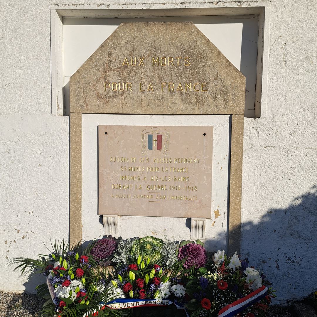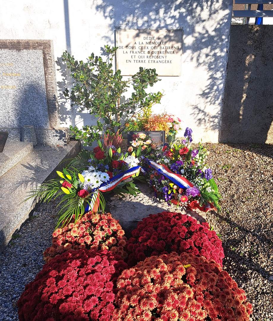 Vendredi 1er novembrre 2024 c'est en présence des élus locaux, de Renaud Beretti, maire d'Aix les Bains, de la gendarmerie, des associations mémorielles, la délégation générale de Savoie était représentée par Jean-Yves Sardella, délegué général adjoint et Edith Sardella, trésorière, de Franck Pécot, président du comité local d'Aix les Bains, des porte-drapeaux et de la population, trois gerbes ont été déposées au carré militaire : une par le Souvenir Français, une par la mairie et une par Marie Dauchy, députée européenne et Brice Bernard, conseiller régional.